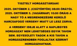 TISZTELT HORGÁSZTÁRSAK! 2025. OKTÓBER 2. (CSÜTÖRTÖK) 08:00 ÓRÁTÓL 2025. OKTÓBER 5. (VASÁRNAP) 10:00 ÓRÁIG A NAGY TÓ A MEGRENDEZÉSRE KERÜLŐ HARCSAFOGÓ VERSENY MIATT LE LESZ ZÁRVA. A VERSENY IDEJE ALATT A NAPIJEGYES HORGÁSZAT NEM LEHETSÉGES EGYIK TAVON SEM. EGYESÜLETI TAGOK A KIS TAVON A HORGÁSZRENDBEN FOGLALTAK SZERINT HORGÁSZHATNAK.