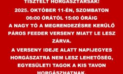 TISZTELT HORGÁSZTÁRSAK! 2025. OKTÓBER 11-ÉN, SZOMBATON 06:00 ÓRÁTÓL 15:00 ÓRÁIGA NAGY TÓ A MEGRENDEZÉSRE KERÜLŐ PÁROS FEEDER VERSENY MIATT LE LESZ ZÁRVA. A VERSENY IDEJE ALATT NAPIJEGYES HORGÁSZATRA NEM LESZ LEHETŐSÉG, EGYESÜLETI TAGOK A KIS TAVON HORGÁSZHATNAK.