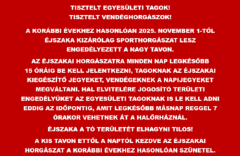 A KORÁBBI ÉVEKHEZ HASONLÓAN 2025. NOVEMBER 1-TŐL ÉJSZAKA KIZÁRÓLAG SPORTHORGÁSZAT LESZ ENGEDÉLYEZETT A NAGY TAVON.