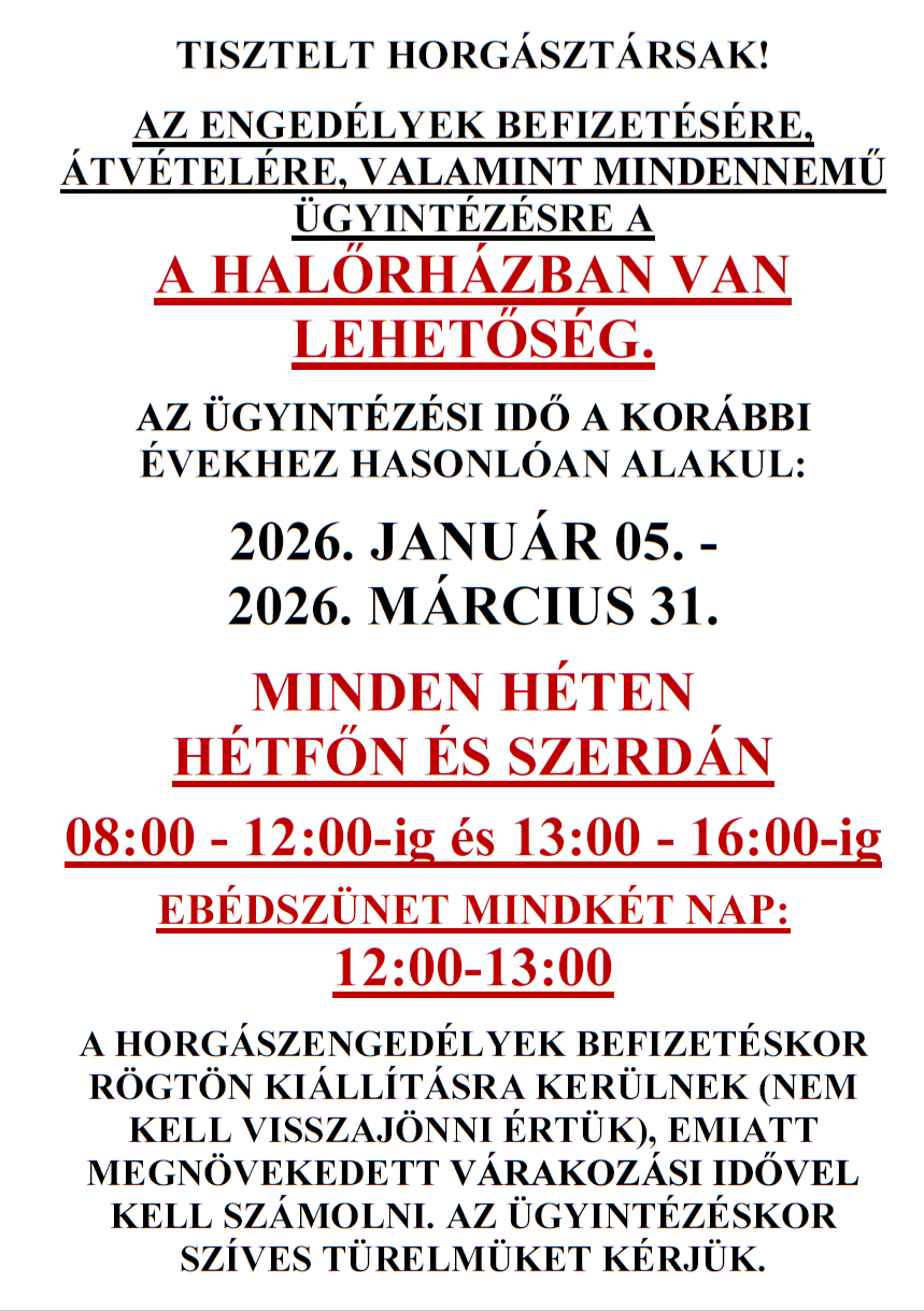 Lőrintei HorgásztóHírek • Irodai nyitvatartás, engedélyek kiváltása 2026
