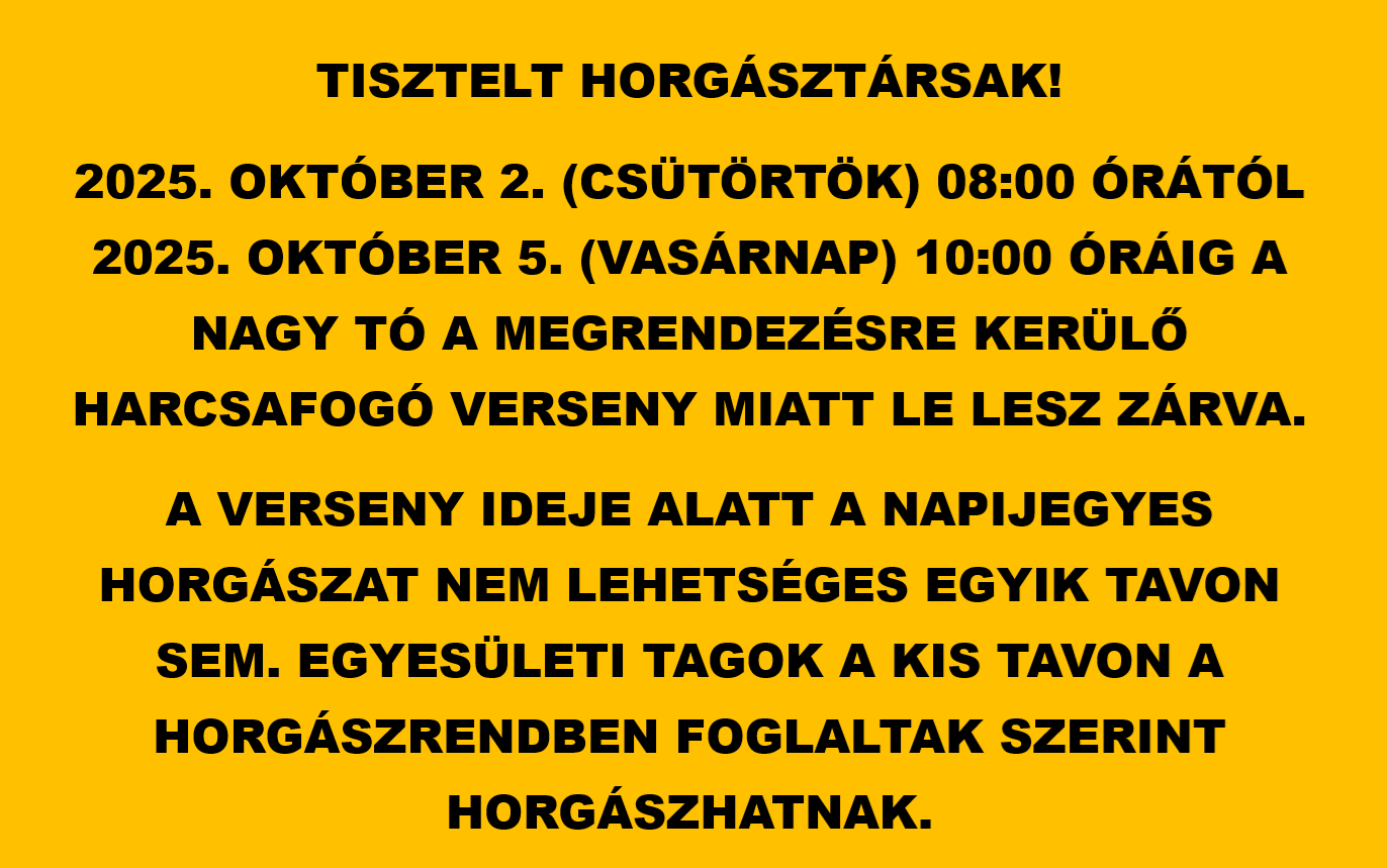 2025. OKTÓBER 2. (CSÜTÖRTÖK) 08:00 ÓRÁTÓL 2025. OKTÓBER 5. (VASÁRNAP) 10:00 ÓRÁIG A NAGY TÓ A MEGRENDEZÉSRE KERÜLŐ HARCSAFOGÓ VERSENY MIATT LE LESZ ZÁRVA.